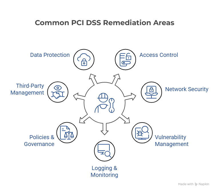 While many findings are technical in nature, the most common remediation items stem from gaps in governance, documentation, and operational consistency. Below are the areas most frequently identified during PCI DSS audits, reflecting common trends under PCI DSS v4.0.1.