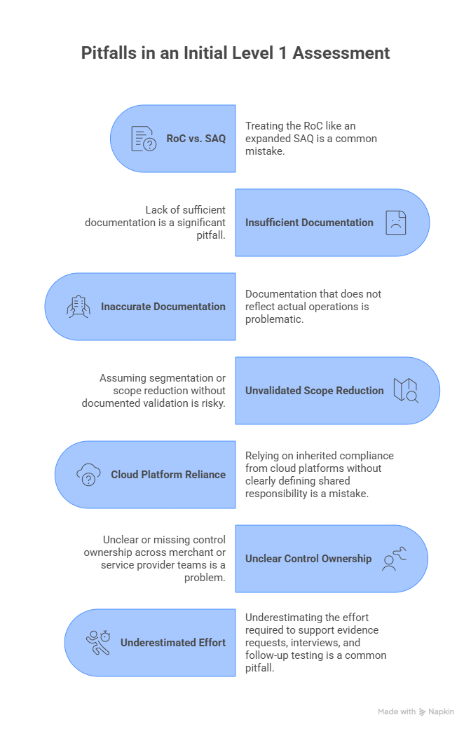 Organizations undergoing their first Level 1 assessment often encounter challenges that were not apparent during SAQ-based compliance. These pitfalls frequently delay assessments, increase remediation effort, or result in unexpected noncompliance findings for both merchants and service providers.