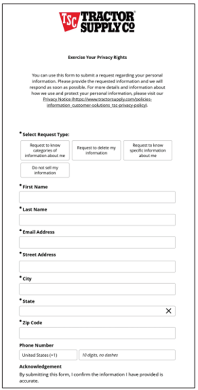Tractor Supply’s website uses cookies and tracking technology that share consumer data with third parties for advertising purposes. The company provided a “Do Not Sell My Personal Information” link in its website footer, which directed consumers to the web form below.