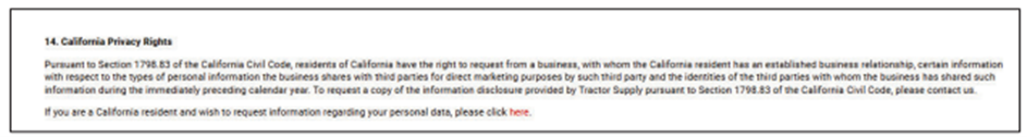 Tractor Supply’s privacy policy (seen below) did not disclose that information.